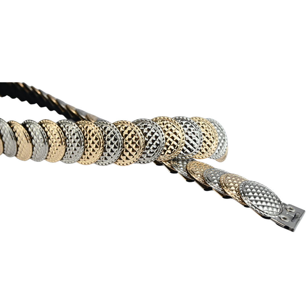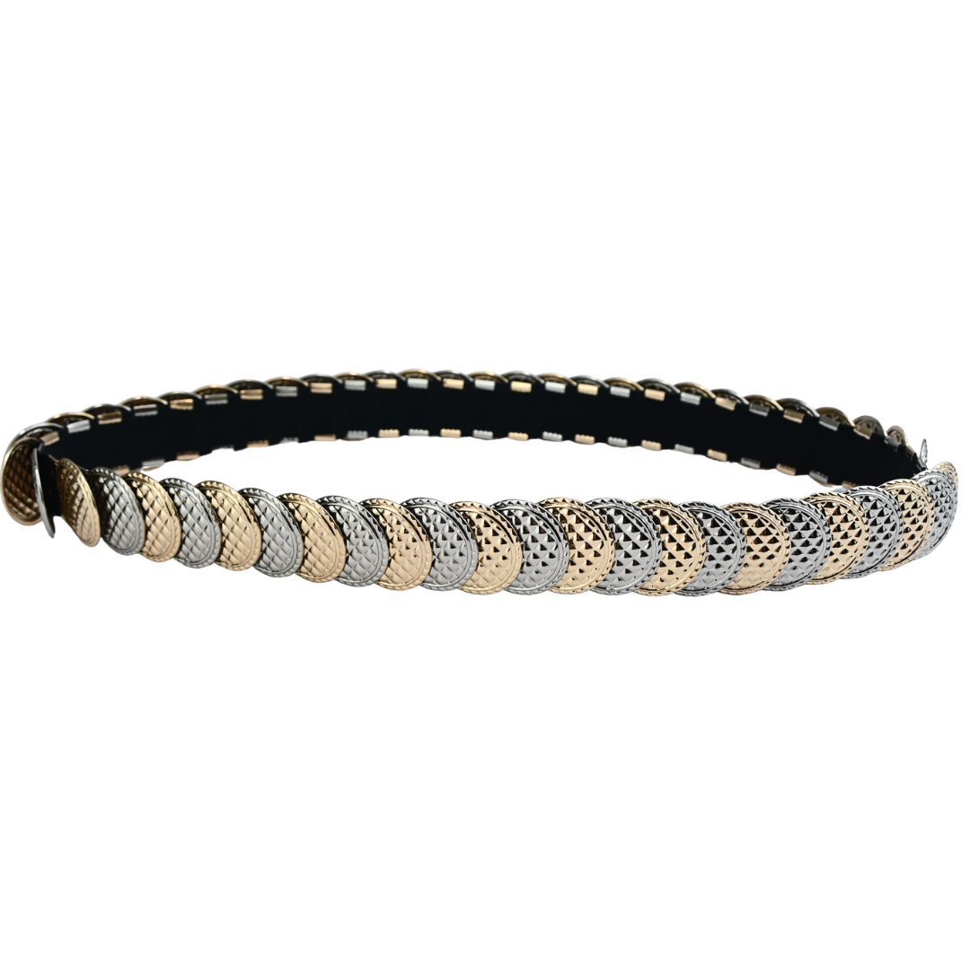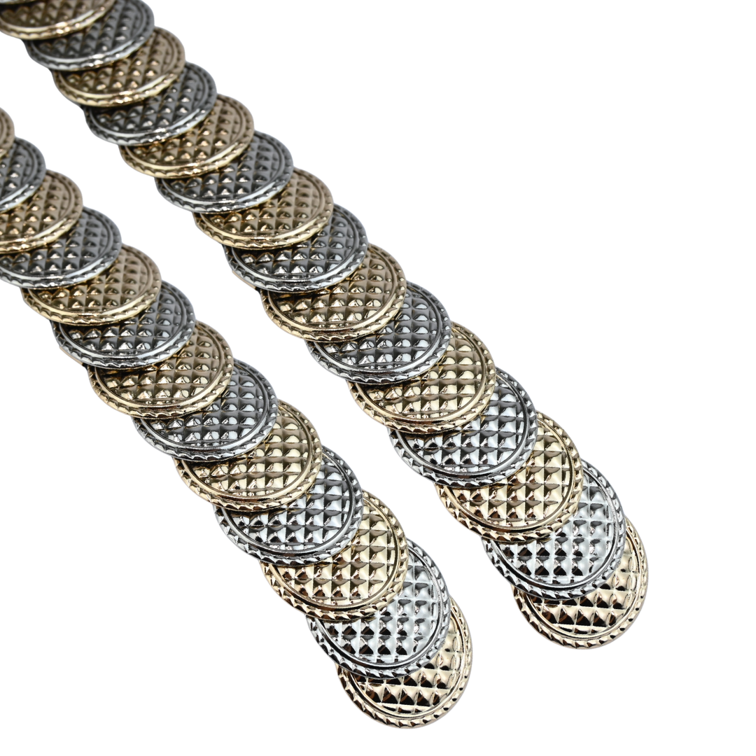 Cinto Moeda Feminino Transforme seu look com este cinto estilo moeda, moderno e cheio de personalidade! Feito com peças redondas metálicas com textura marcada em padrão entrelaçado, ele entrega um visual elegante, rústico e super estiloso. Destaques do Produto: Peças metálicas em formato de moedas com relevo acabamento vintage nas cores prata envelhecida e dourado envelhecido flexível, resistente e confortável ideal para compor looks casuais, boho, festival, moda praia ou acessórios artesanais.Pode ser usado como cinto, detalhe de roupa, acessórios criativos, customização e muito mais Material: Metal resistente com acabamento trabalhado Por que escolher este modelo? É um acessório versátil, marcante e cheio de estilo, perfeito para quem busca algo diferente, artesanal e com pegada vintage.