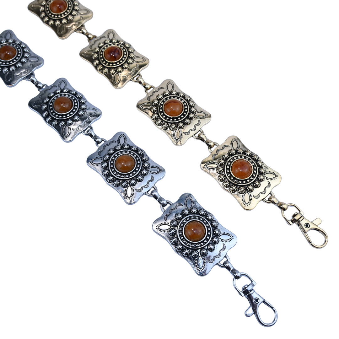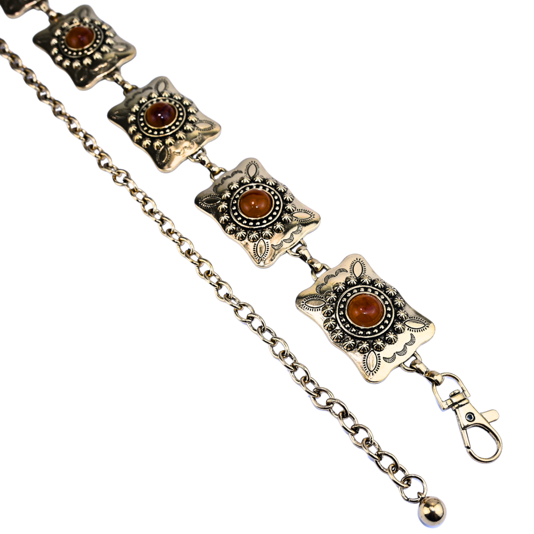 Cinto ou corrente decorativa confeccionada em metal resistente, com lindas placas ornamentadas em relevo e detalhe central em pedra sintética de tom âmbar. Possui acabamento trabalhado, com design sofisticado e estilo boho/western, ideal para quem busca um acessório marcante e diferenciado.