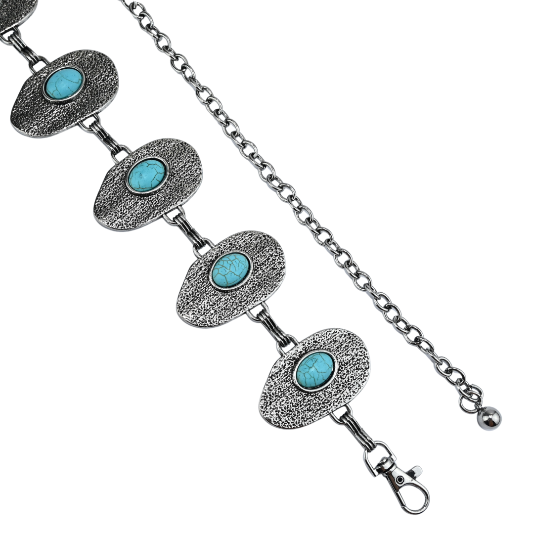 Acessório elegante e marcante, confeccionado em metal resistente com acabamento texturizado. Possui placas ovais interligadas, com detalhe central em pedra sintética, disponíveis em duas variações de cor: azul turquesa e tom âmbar. Ideal para compor looks modernos, boho, western ou vintage. Conta com fechos tipo mosquetão nas extremidades, garantindo praticidade, segurança e ajuste fácil. Pode ser usado como cinto decorativo, corrente para cintura ou acessório fashion para diversas combinações. Características do produto: Material: Metal resistente Detalhes: Placas ovais texturizadas com pedra sintética central Estilo: Boho, Western, Vintage Fechamento: Mosquetão nas extremidades Indicado para: Looks casuais, boho chic, country ou fashion, festas, shows, eventos, festivais e produções especiais quem busca um acessório diferenciado e sofisticado