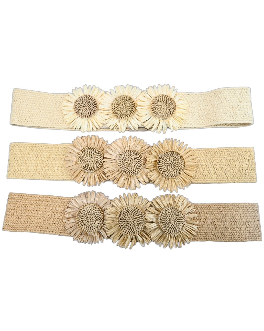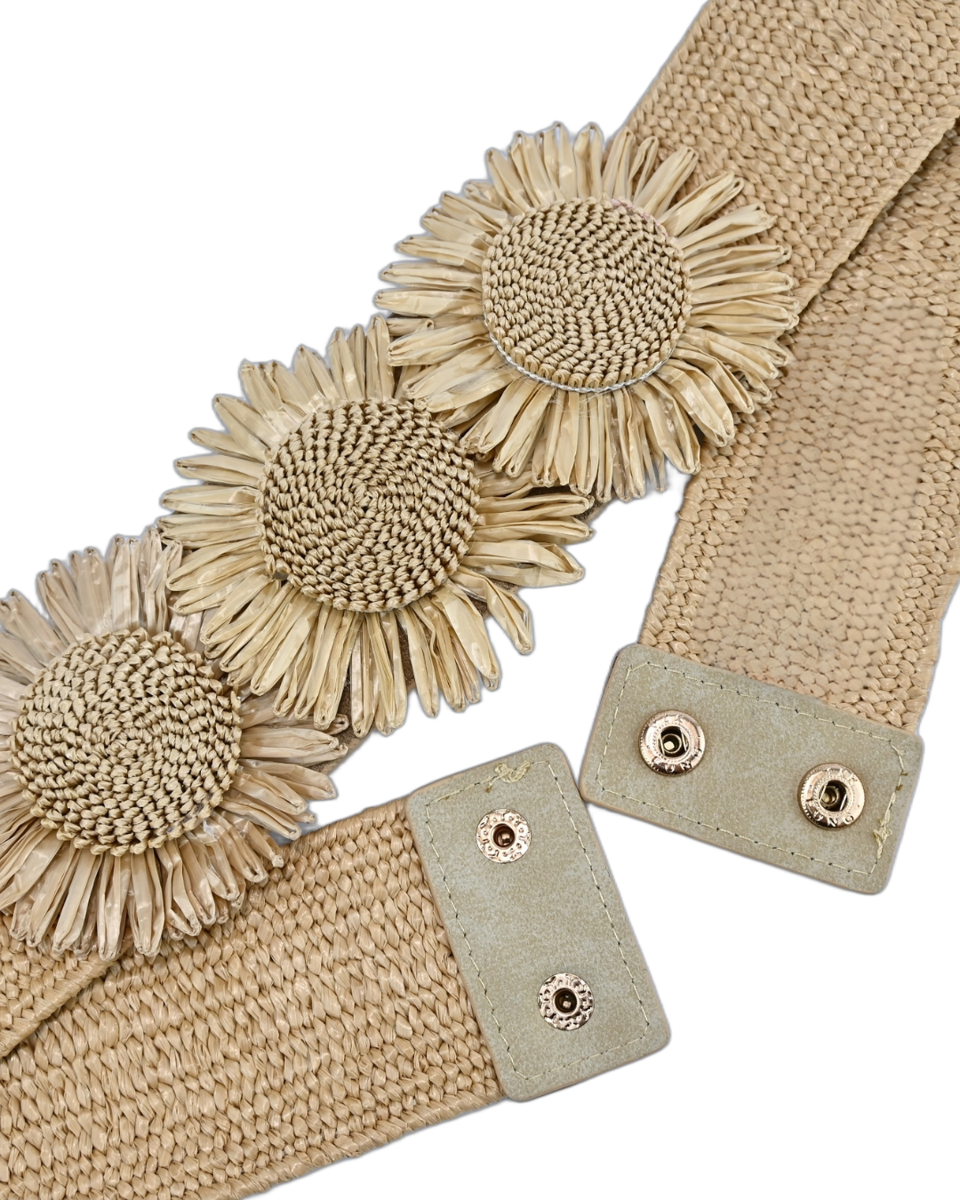Este cinto feminino é feito com material trançado estilo palha e acabamento em lindas flores artesanais. Perfeito para usar com vestidos, saias e looks de verão! destaques do Produto