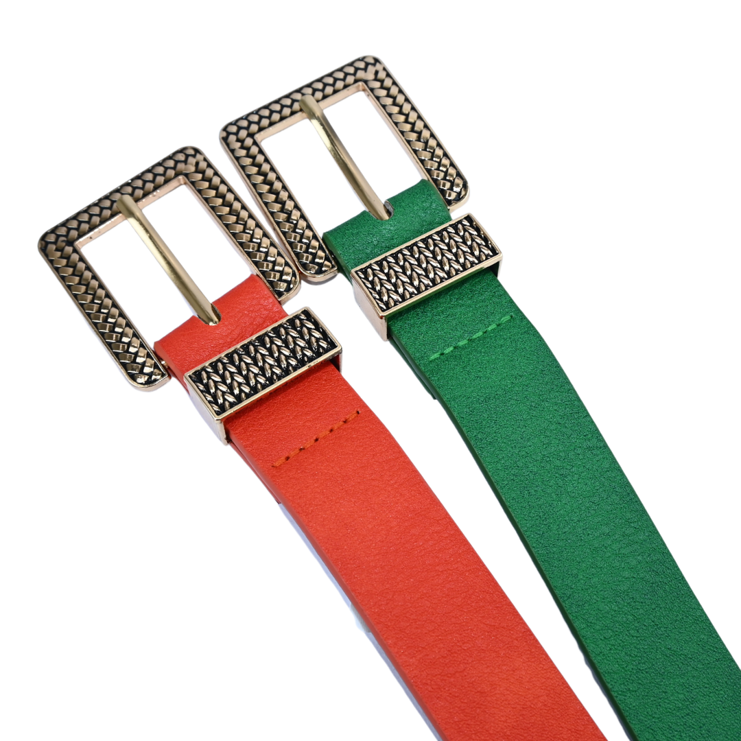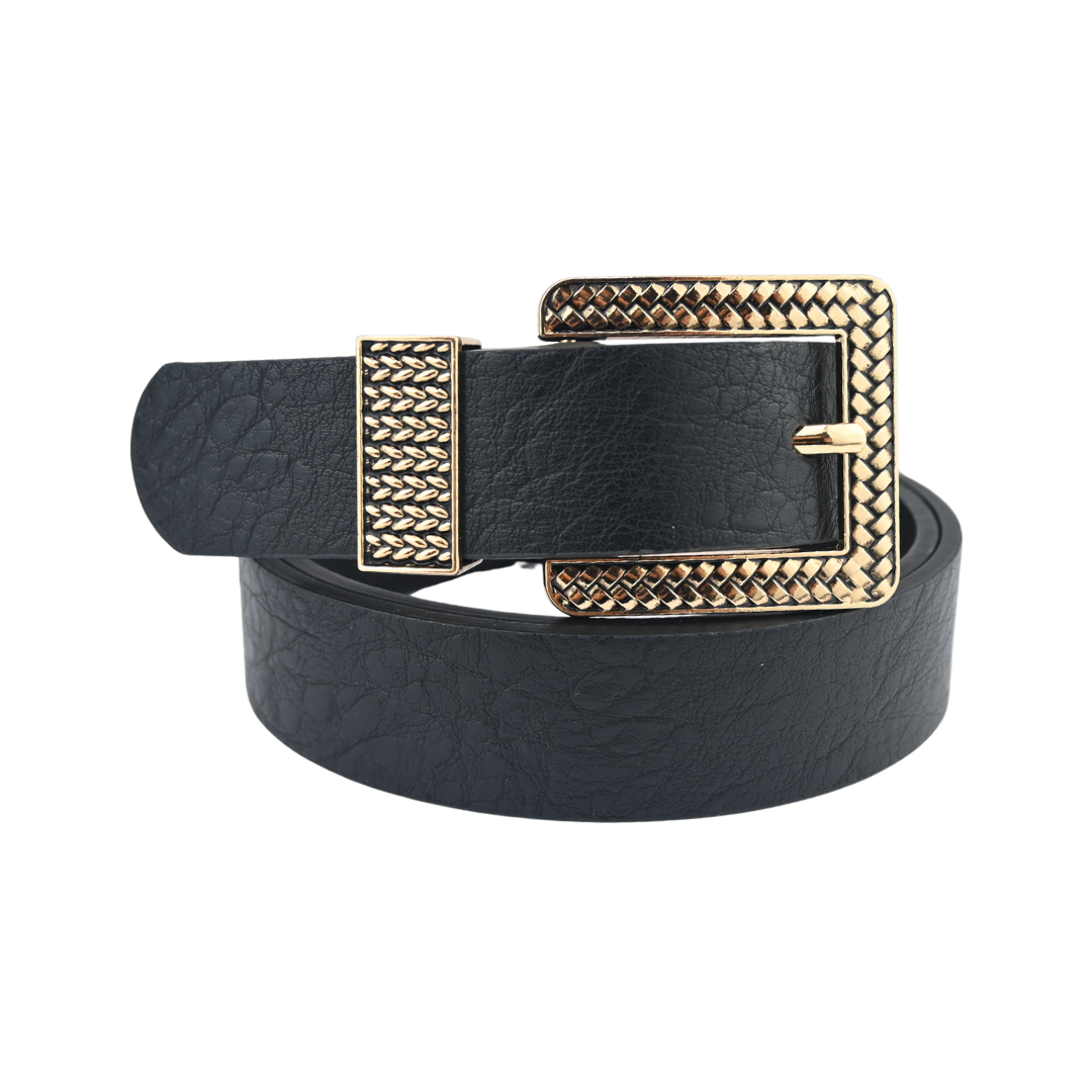 Cinto feminino confeccionado em material sintético de alta qualidade, com fivela dourada quadrada em metal trabalhado, que proporciona um visual moderno, elegante e diferenciado. Ideal para compor looks casuais ou mais sofisticados, valorizando qualquer produção.