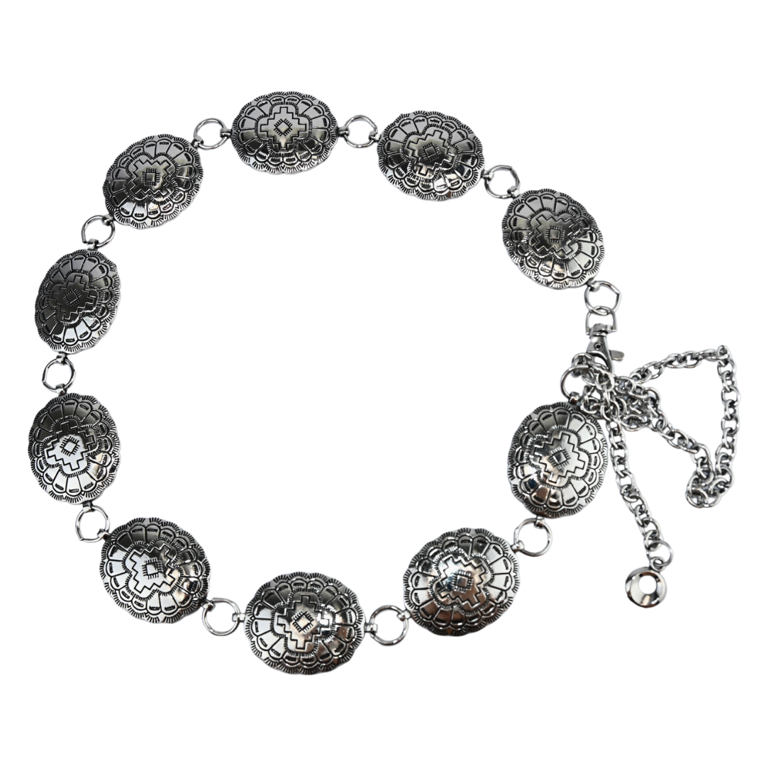 Cinto feminino confeccionado em metal resistente, com belíssimos medalhões em alto-relevo, inspirado no estilo western/boho. Possui acabamento sofisticado em tons dourado e prateado, ideal para compor looks modernos, country ou fashion. O modelo conta com fechos tipo mosquetão, permitindo ajuste prático e uso confortável na cintura ou no quadril.