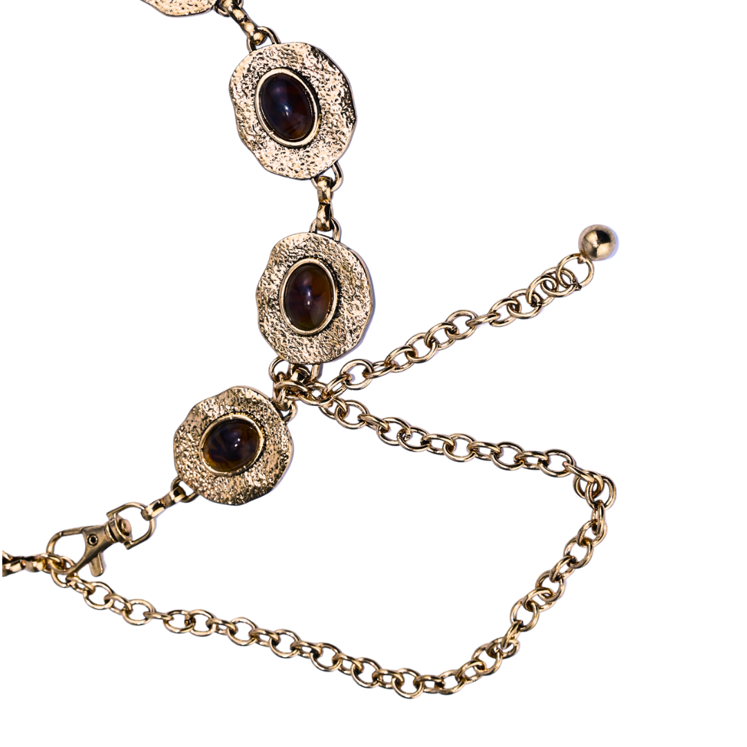 Cinto feminino sofisticado, com design marcante e acabamento texturizado, ideal para valorizar produções casuais ou elegantes. Confeccionado em metal resistente, possui placas ovais com pedras decorativas que trazem um visual artesanal e moderno ao acessório.