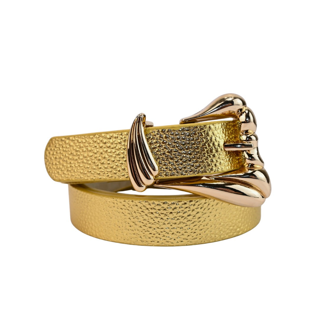 O cinto perfeito para elevar qualquer look! Com um design sofisticado, este cinto feminino apresenta uma fivela escultural dourada que combina elegância e personalidade. Seu acabamento refinado e formato levemente curvado garantem um ajuste confortável e marcante na cintura. Ideal para ser usado com calças, vestidos ou sobre casacos, ele transforma o visual com um toque de luxo e estilo.